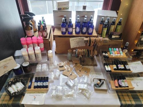 Locally made essential oil products which include lotion bars, headache sticks, room sprays, mask refresher sprays, and more!